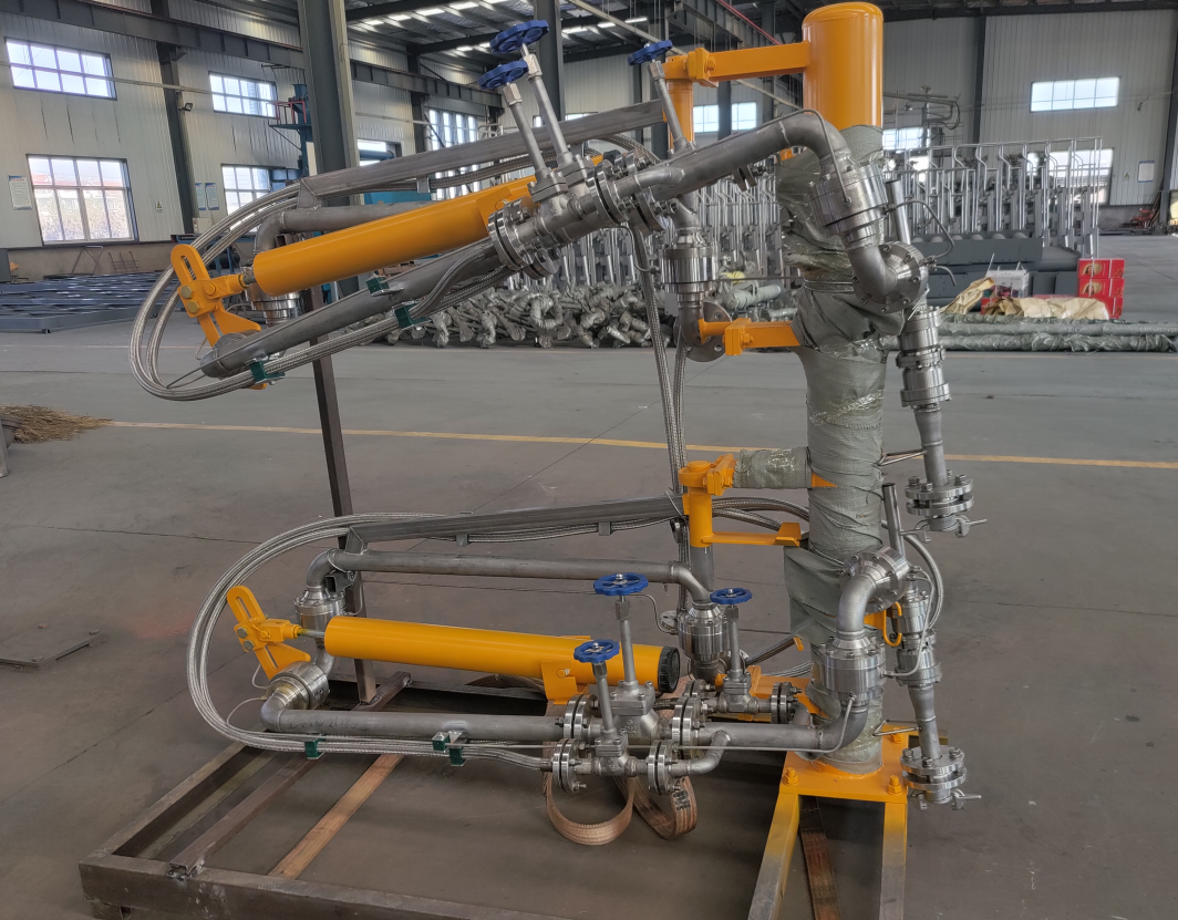 LNG、乙烯裝卸車臂的主要功能用于在罐車和管線間建立通道,完成主要的裝卸車功能;另外與回收裝置相聯(lián),用于平衡罐車內(nèi)壓力。低溫裝車臂主要分為氣相和液相兩條臂,兩條臂共同裝在一個(gè)立柱上。實(shí)現(xiàn)低溫介質(zhì)的裝卸車和回氣補(bǔ)氣,每個(gè)獨(dú)立的裝卸臂分為內(nèi)臂、外臂及和槽車連接的前部外伸臂。在裝卸臂的外臂上一般設(shè)立用于主管線關(guān)斷的球閥及在兩邊用于氮?dú)庵脫Q的旁路球閥,外臂有一彈簧平衡系統(tǒng)用來(lái)平衡外臂、外伸臂的重量,便于操作裝車。