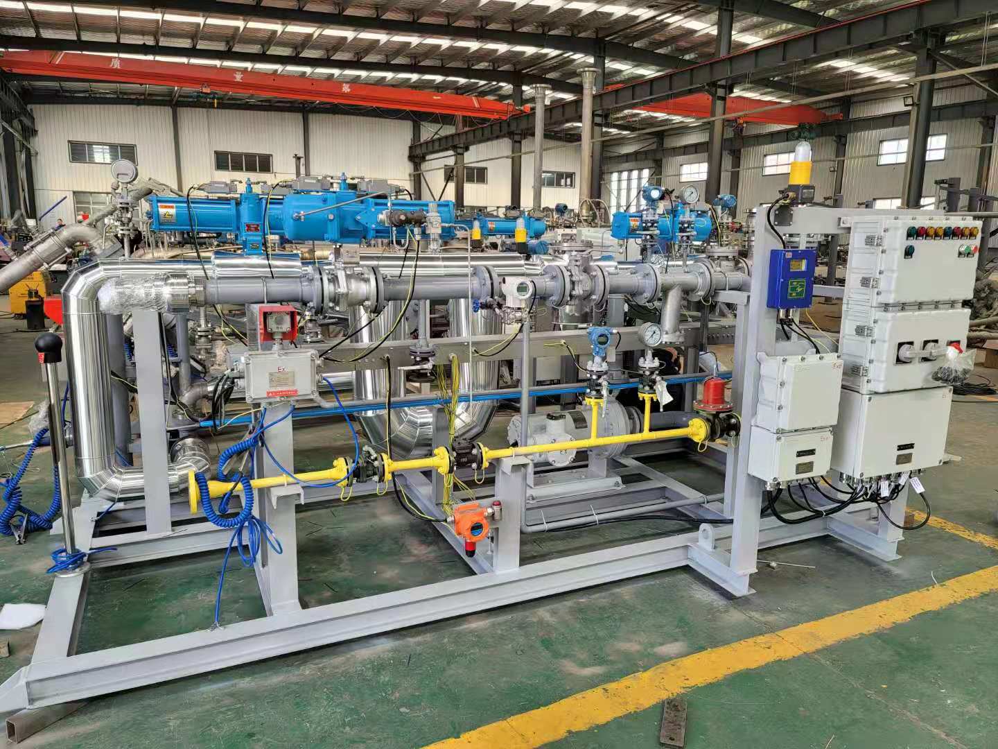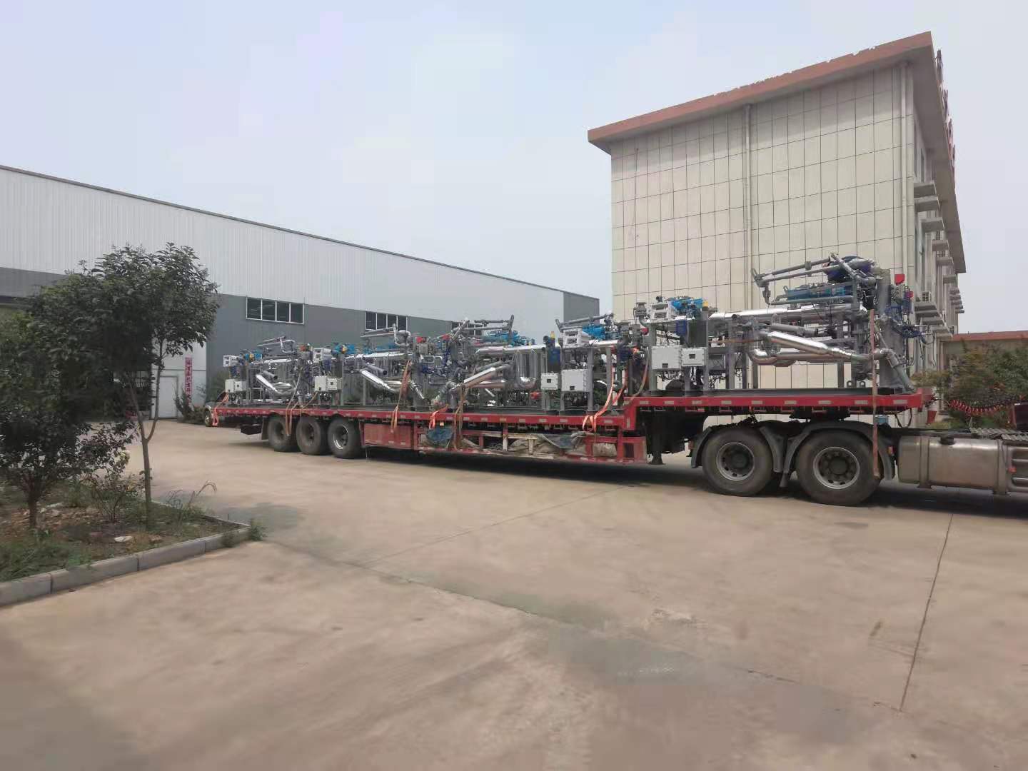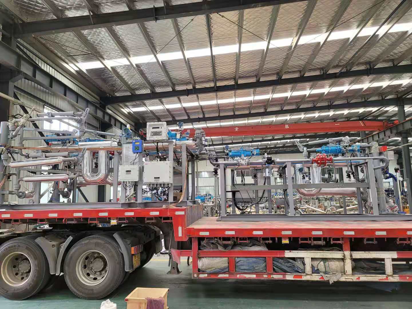 油品及化工品定量裝車橇裝組是指將每一個裝車鶴位內(nèi)的儀表和設(shè)備集成在一個專用的框架結(jié)構(gòu)內(nèi),儀表和設(shè)備包括裝車鶴管、流量計、防溢油靜電報警控制器、壓力變送器、裝車流量控制閥、緊急切斷閥,裝車泵、批量控制器等, 只預(yù)留工藝連接口和控制電源和通訊接口,這個整體集成部分稱為裝車橇。與傳統(tǒng)的裝車控制系統(tǒng)就地組裝比較,裝車橇可以節(jié)省現(xiàn)場設(shè)計和現(xiàn)場施工量,縮短項目工期,提高裝車控制系統(tǒng)的質(zhì)量。以下是近期公司定量裝車撬的生產(chǎn)及發(fā)貨現(xiàn)場。