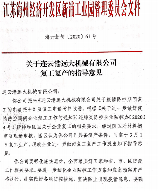 在前期的精心準(zhǔn)備下,我公司已于3月1日通過(guò)疫情防控、安全生產(chǎn)、環(huán)保生產(chǎn)三項(xiàng)驗(yàn)收,3月2日獲得復(fù)工批文并于今日正式復(fù)工。公司將強(qiáng)化底線思維,全面落實(shí)好國(guó)家和省、市、區(qū)防疫工作的相關(guān)要求。在扎實(shí)做好各項(xiàng)防控措施的基礎(chǔ)上,堅(jiān)決杜絕疫情的發(fā)生。